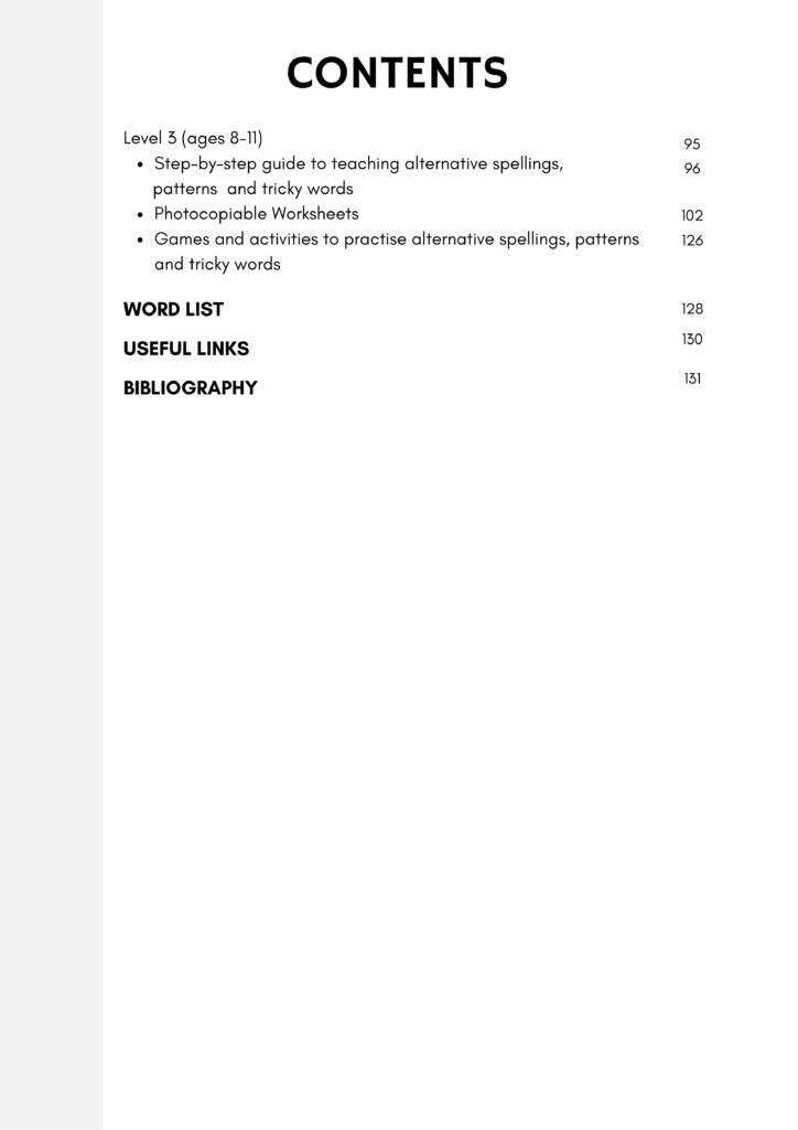 Carefully selected words for each sound and digraph, matching the needs of learners whose first language is not English (with mainly Spanish speakers in mind).
